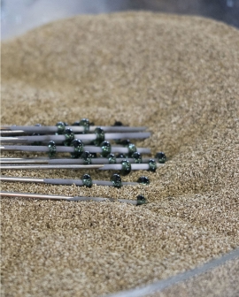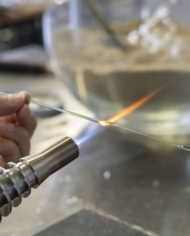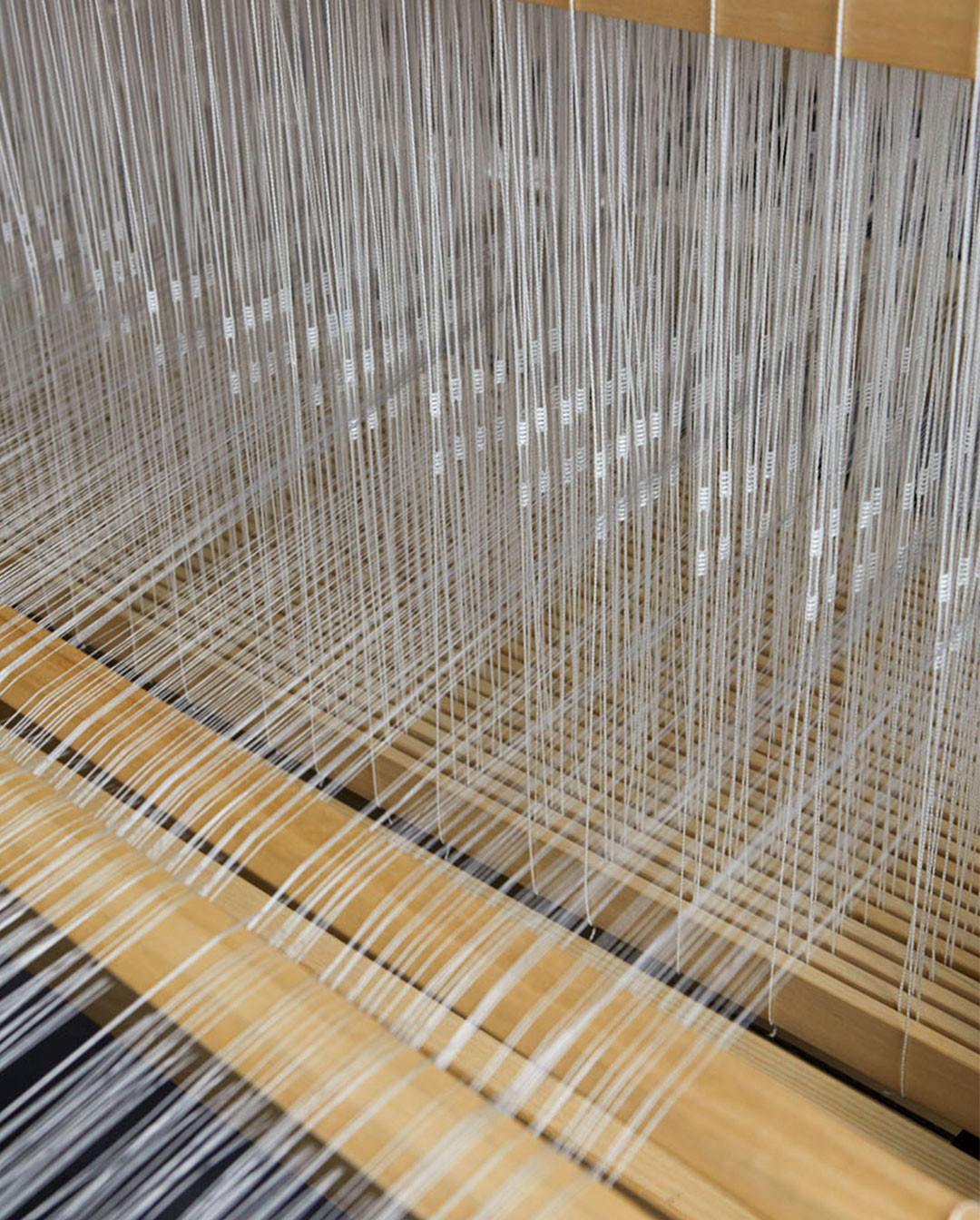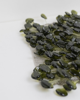 Multiple experiments in artisanal weaving, where different types of glass threads (yarns, beads, jewelry, sculptures) intersect with textile threads of seaweed, nettle, linen, hemp and metal.